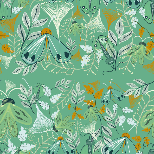 Diseño de escarabajos y polillas verde marina con flores naranjas y blancas sobre fondo verde medio. (Categoría INS)