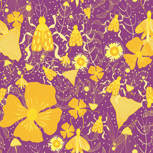 Diseño de escarabajos amarillos y fkores anarillo intenso fondo fuxia oscuro intenso. (Categoría INS)