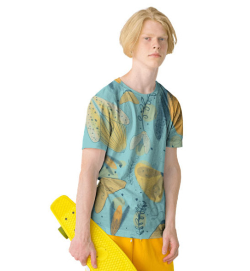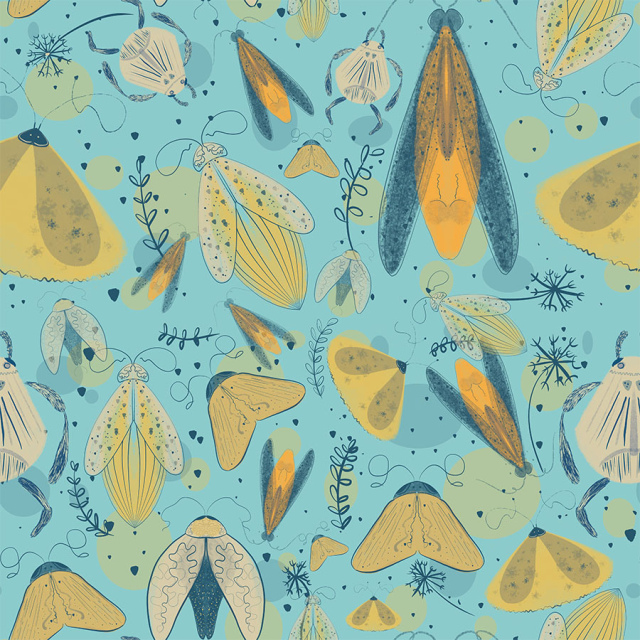 Diseño de polillas amarillas y azules sobre fondo celeste. (Categoría INS)