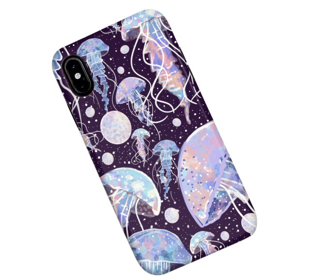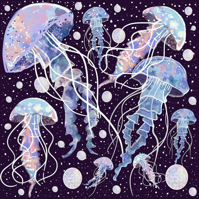 Diseño de meduzas blanco y lila con fondo morado oscuro puntos blancos. (Categoría Mar/Océano - MAR)