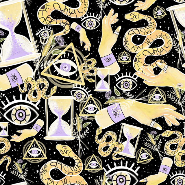 Diseño de manos de bruja, reloj de arena, serpiente y ojo, amarillo claro lila y blanco con fondo negro. (Categoría MYS)