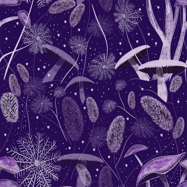 Diseño hongos y dientes de leon con espigas blancas fondo morado oscuro. (Categoría Naturaleza - NAT)