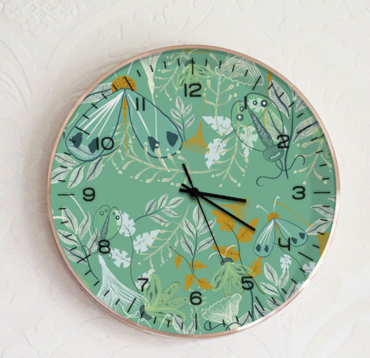 Diseño de escarabajos y polillas verde marina con flores naranjas y blancas sobre fondo verde medio. (Categoría INS)