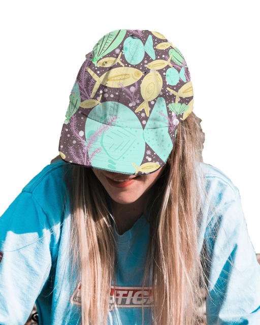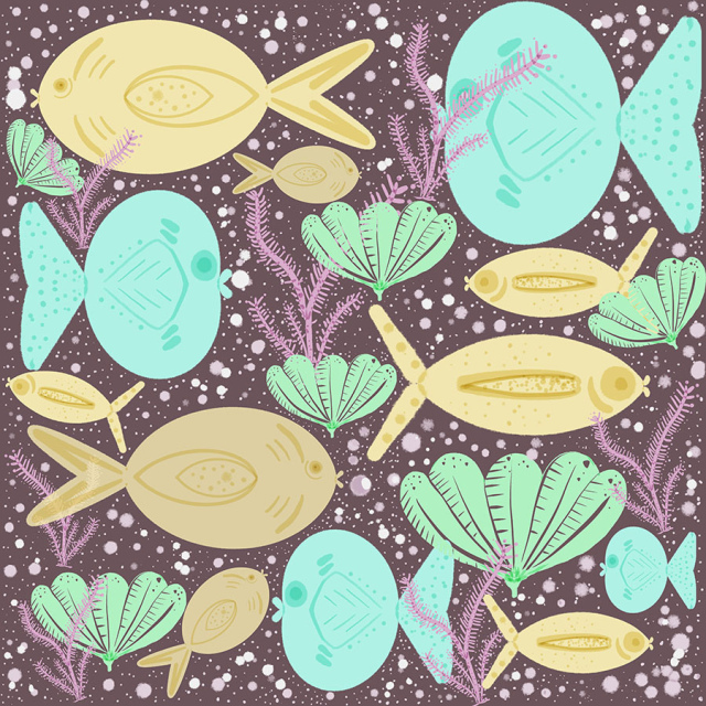 Diseño de peces amarillos y celeste coral fuxoa fondo malva oscuro. (Categoría Mar/Océano - MAR)