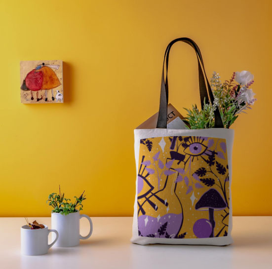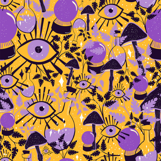 Diseño de ojos, bolas de cristal hongos lilas y morado sobre amarillo calido. (Categoría MYS)