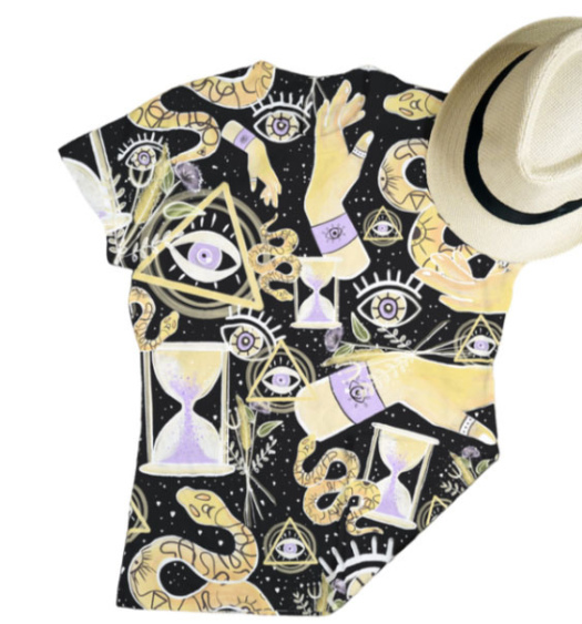 Diseño de manos de bruja, reloj de arena, serpiente y ojo, amarillo claro lila y blanco con fondo negro. (Categoría MYS)