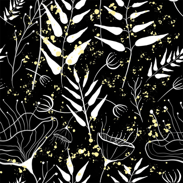Diseño de flores y hojas blancas puntos amarillos fondo negro. (Categoría Naturaleza - NAT)